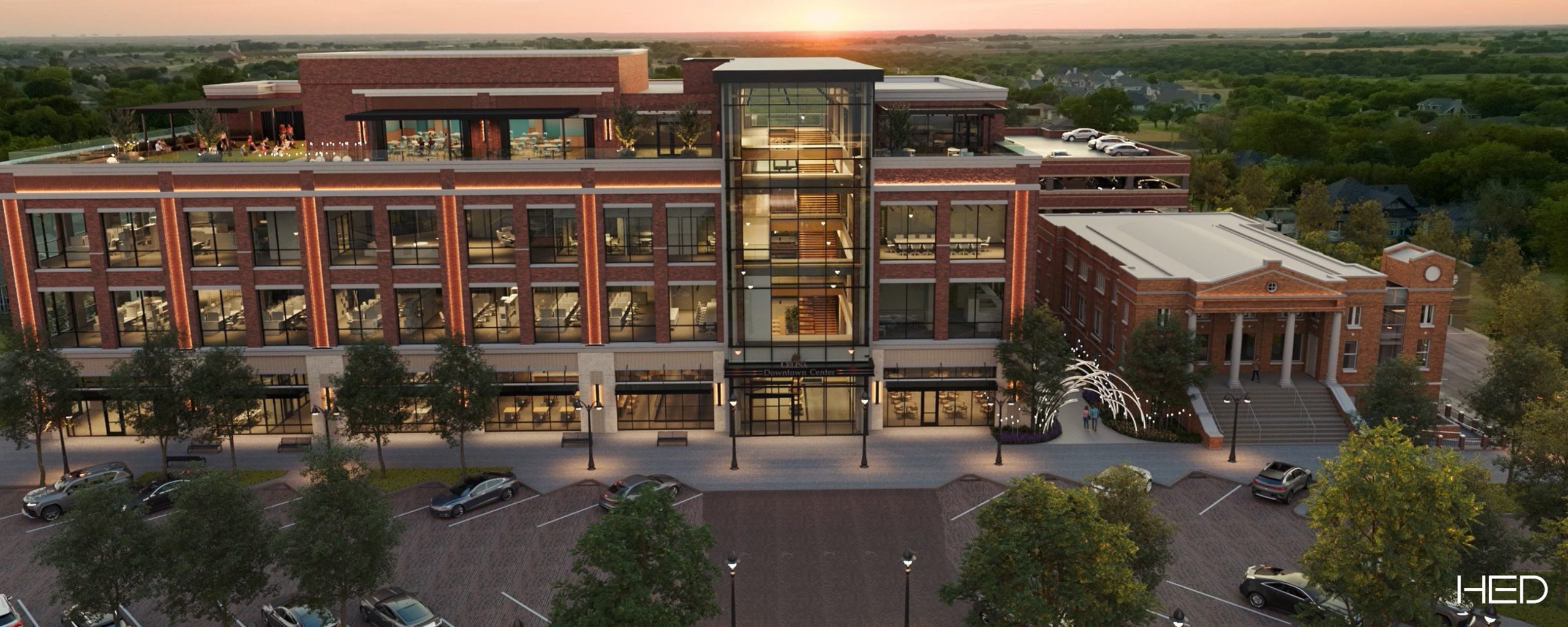 The Celina Administration Building & Parking Garage is a transformative development designed to meet both governmental and public needs. This 5-story facility (4 above grade, 1 subterranean) spans 105,000 square feet, accommodating a public library alongside government office space. A centerpiece of the design is the 5-story atrium, which visually and physically connects all levels from the basement to the occupied roof level, creating a bright, open, and inviting interior environment. Constructed primarily of concrete, the building utilized a Type IIA construction type strategy that also allowed for the incorporation of cross-laminated timber to enhance sustainability and aesthetics. Adjacent to the main facility, a new parking garage addresses longstanding parking challenges, providing much-needed capacity and improving accessibility for municipal staff and the public alike. This building was also designed to accommodate for a full conversion throughout to public library space as part of the building’s 10-year outlook.