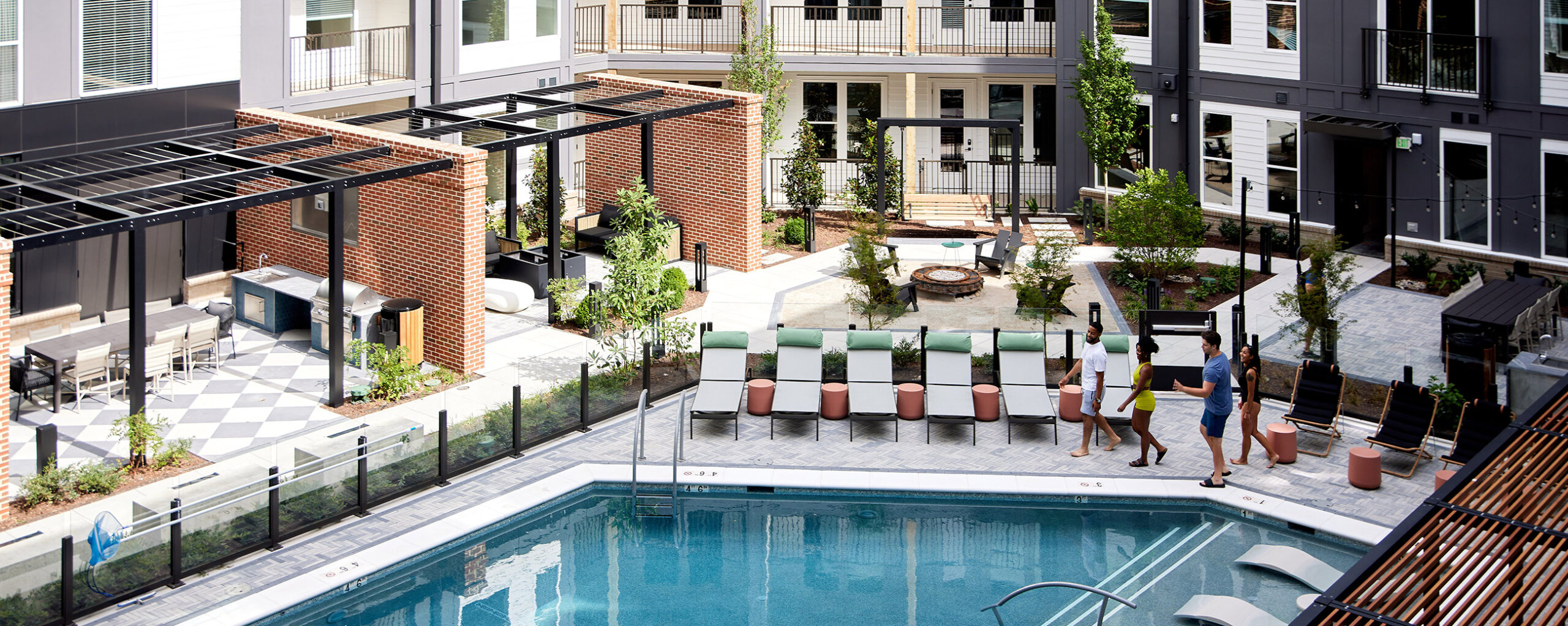 The Novel Scott’s Addition project is a seven-story podium apartment building in Richmond, Virginia’s dynamic Greater Scott’s Addition neighborhood. The building features 275 carefully designed residential units, from one- and two-bedroom apartments to loft-style dwellings on the top floor. Residents enjoy an array of high-end amenities, including lounge spaces, a saltwater pool with cabana, a rooftop sky lounge, a hidden cocktail lounge, and a 356-space parking garage.